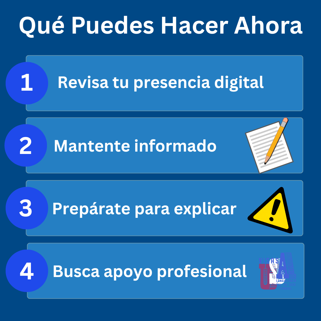 Revisa tu presencia digital. Asegúrate de que tus publicaciones públicas no se presten a malentendidos, y si tu visa es F, M, o J, es un requisito que mantengas abierta al público tu perfil.